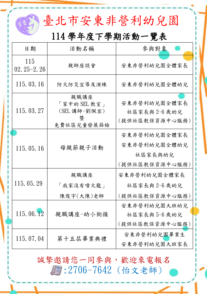 114學年度下學期園內暨社區活動一覽表