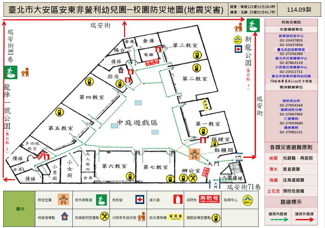 幼兒園平面配置圖,平時彙整幼兒園空間配置資訊,災時得以依據幼兒園出入口及鄰外道路,判讀圖資及相對位置,以利執行相關應變作為。